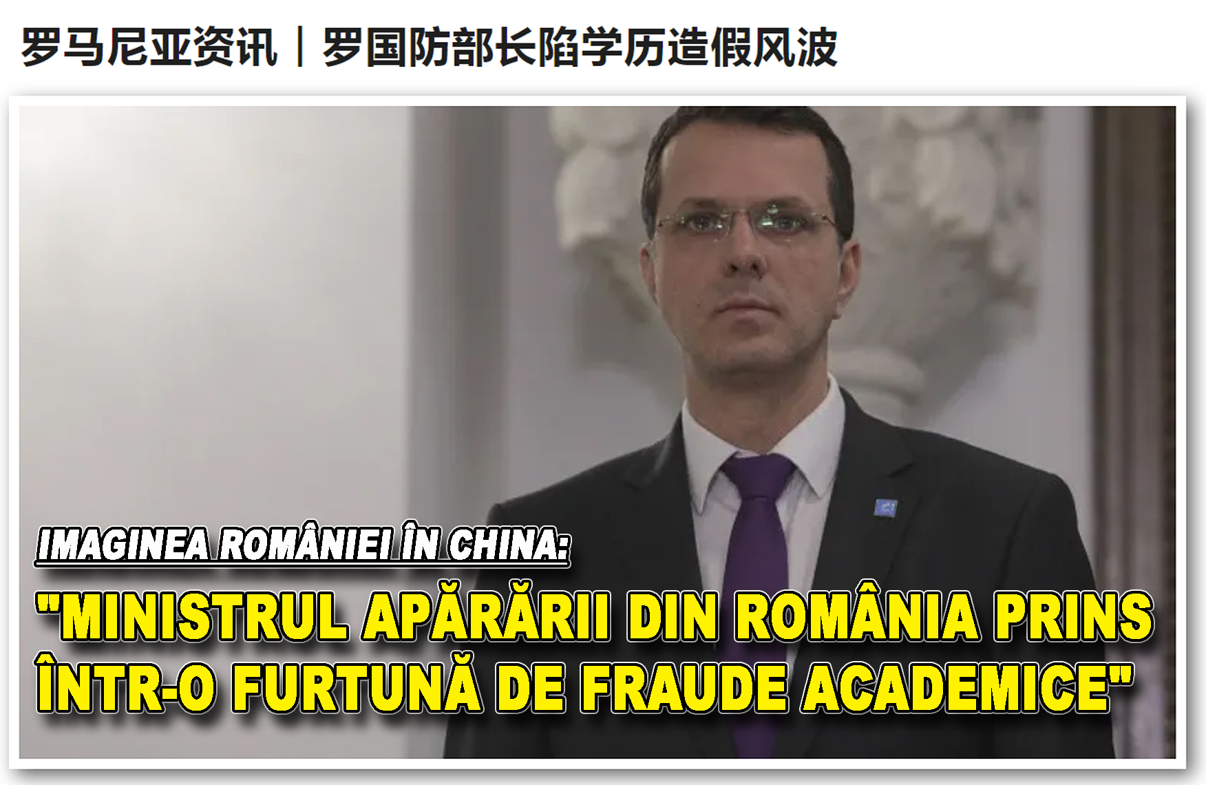 „Ministrul Apărării din România prins într-o furtună de fraude academice” este titlul sub care este prezentată noua criză de imagine prin care trece Guvernul de la București, în care este implicat ministrul Apărării Naționale, Ionuț Moșteanu. În cadrul unui articol promovat pe rețelele de socializare din China, sunt prezentate explicațiile oferite de ministrul Moșteanu cu privire la “controversele academice”, diploma de licență de la Universitatea Bioterra și de masterat de la Universitatea din București.
